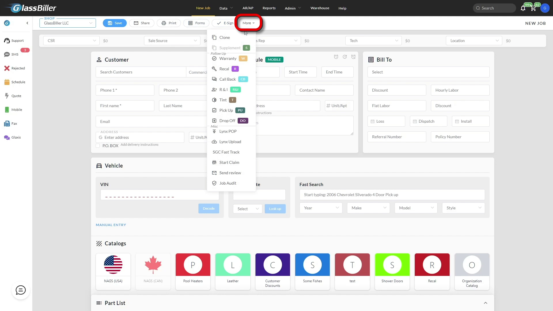 To start, navigate to the Glassbiller application and go to the Job screen. Under the More tab, click on SGC Fast Track.