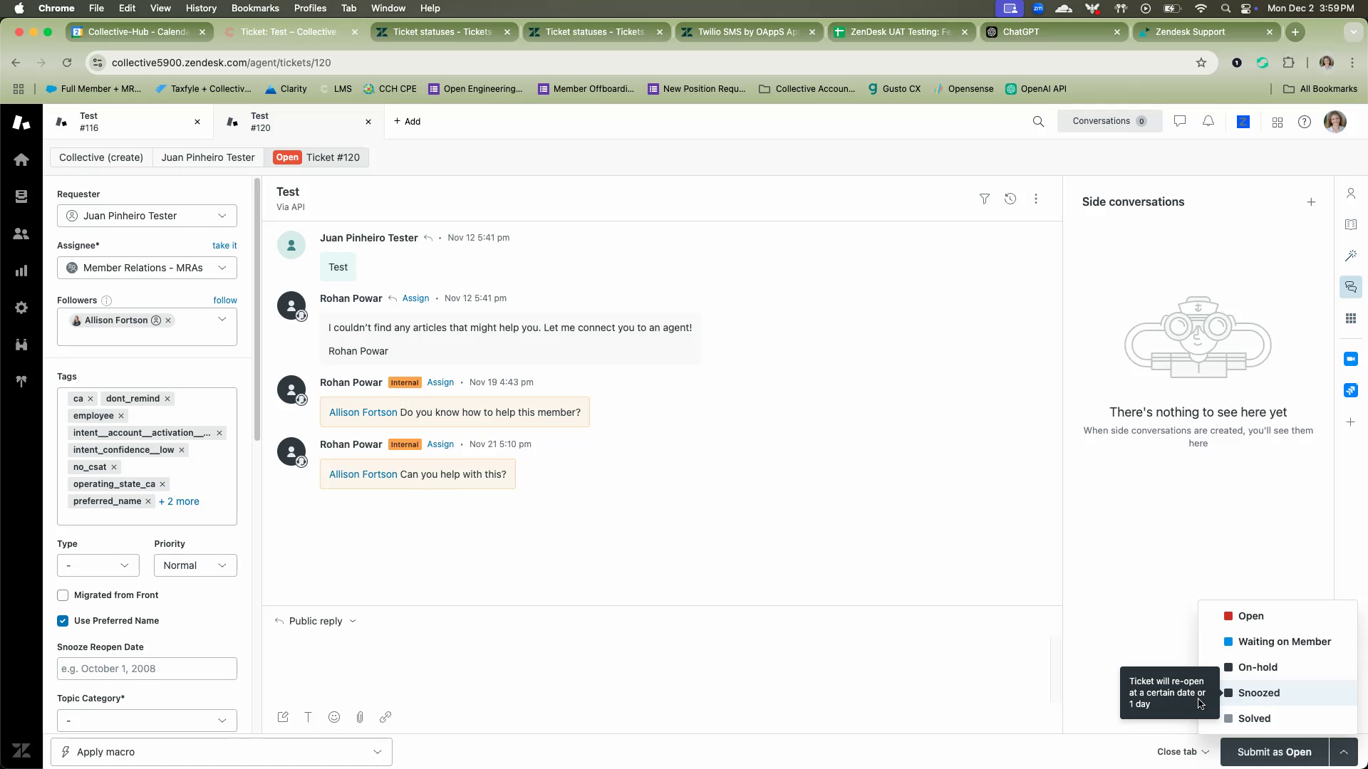 After selecting your desired snooze date, submit the action. The ticket will then be snoozed and will reopen on the specified date.