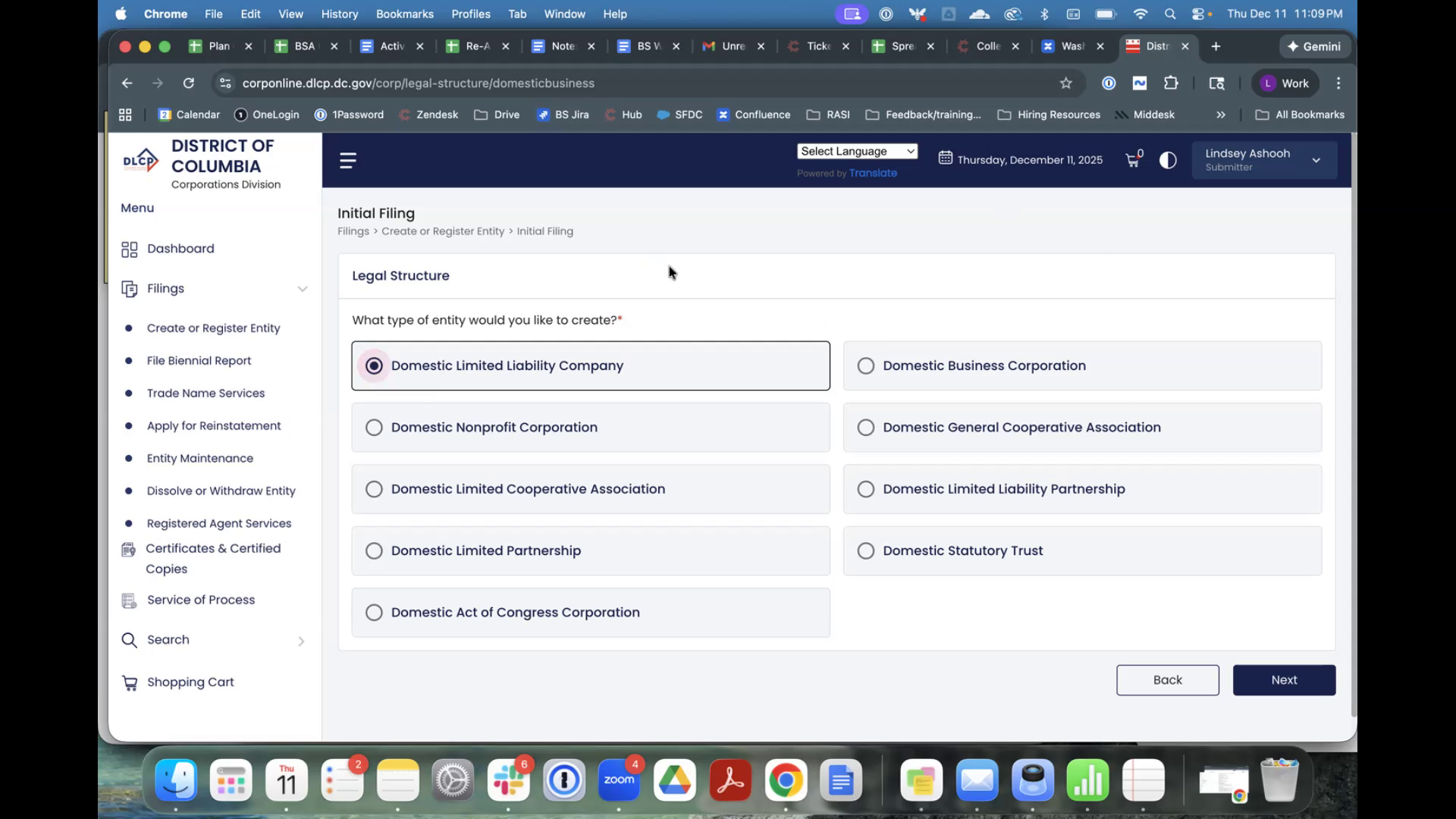 Choose "Domestic Limited Liability Company" as the legal structure, then click "Next."